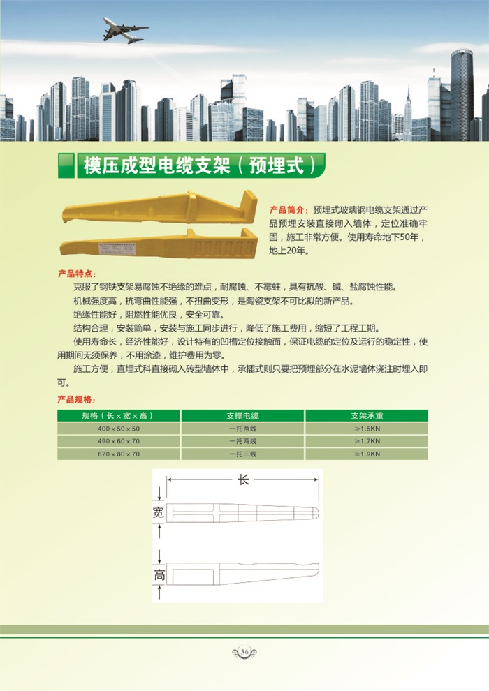 預埋式玻璃鋼電纜支架通過產品預埋安裝直接砌入墻體,定位準確牢固,施工非常方便。使用壽命地下50年,地上20年